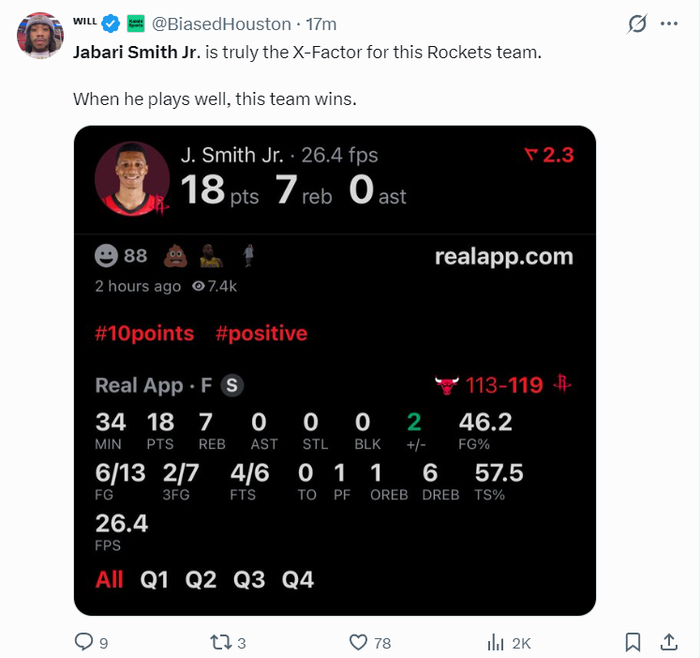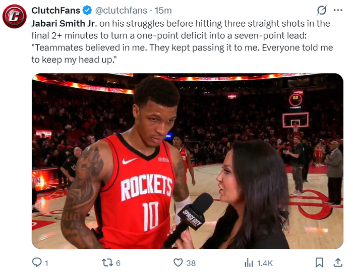 火箭记者Bradeaux写道:这场比赛史密斯在决胜时刻3中3拿到8分,他在连续投丢了20个三分球后完成了三分2中2,他的三分球终结了比赛,他最终拿到18分,真实命中率57.5%值得称道。